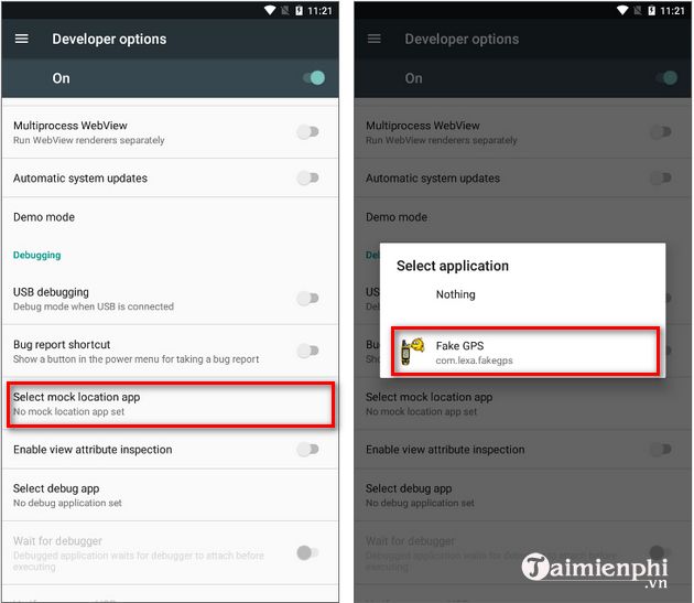 Bước tiếp theo là cấu hình ứng dụng Fake GPS location trong menu Tùy chọn nhà phát triển. Bạn thực hiện như sau:- Vào Tùy chọn nhà phát triển (Developer options) trong Cài đặt (Settings).- Chọn Ứng dụng vị trí mô phỏng (Mock location app). Trên một số điện thoại Android khác, tùy chọn này có thể có tên là Chọn ứng dụng vị trí mô phỏng hoặc Cho phép vị trí mô phỏng.- Chọn Fake GPS trong danh sách ứng dụng bạn đã cài đặt.