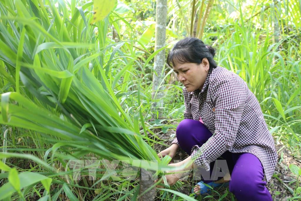Chị Lâm Hồng Phượng (sinh năm 1980) ngụ ấp Tây Kinh, xã Bình Hòa, huyện Giồng Trôm đã thoát nghèo sau khi được hỗ trợ vốn chăn nuôi. Ảnh: Chương Đài - TTXVN