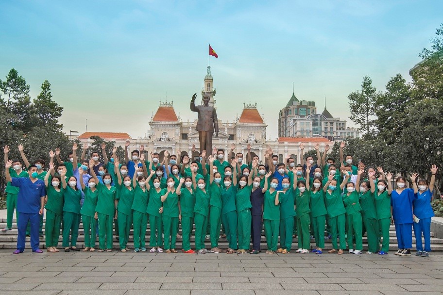 Chào TP. Hồ Chí Minh thân yêu. Tập thể các y, bác sĩ Việt Tiệp - Hải Phòng vào công tác tại bệnh viện dã chiến thu dung, Tác giả: Nguyễn Mạnh Cường
